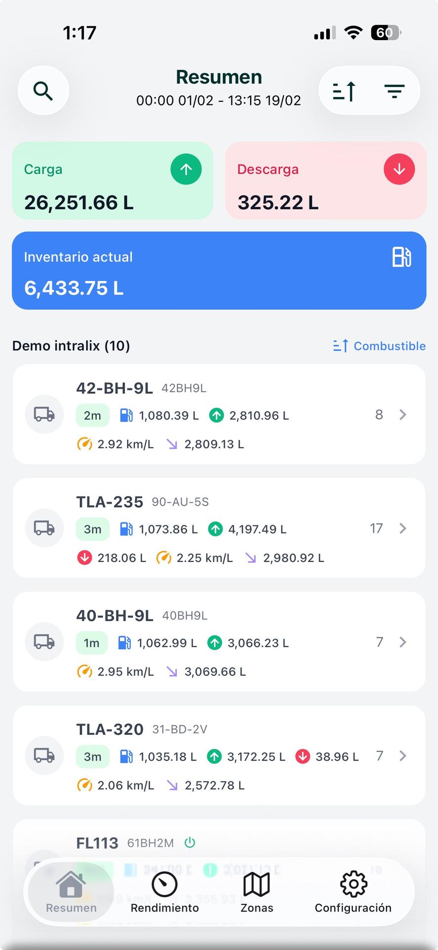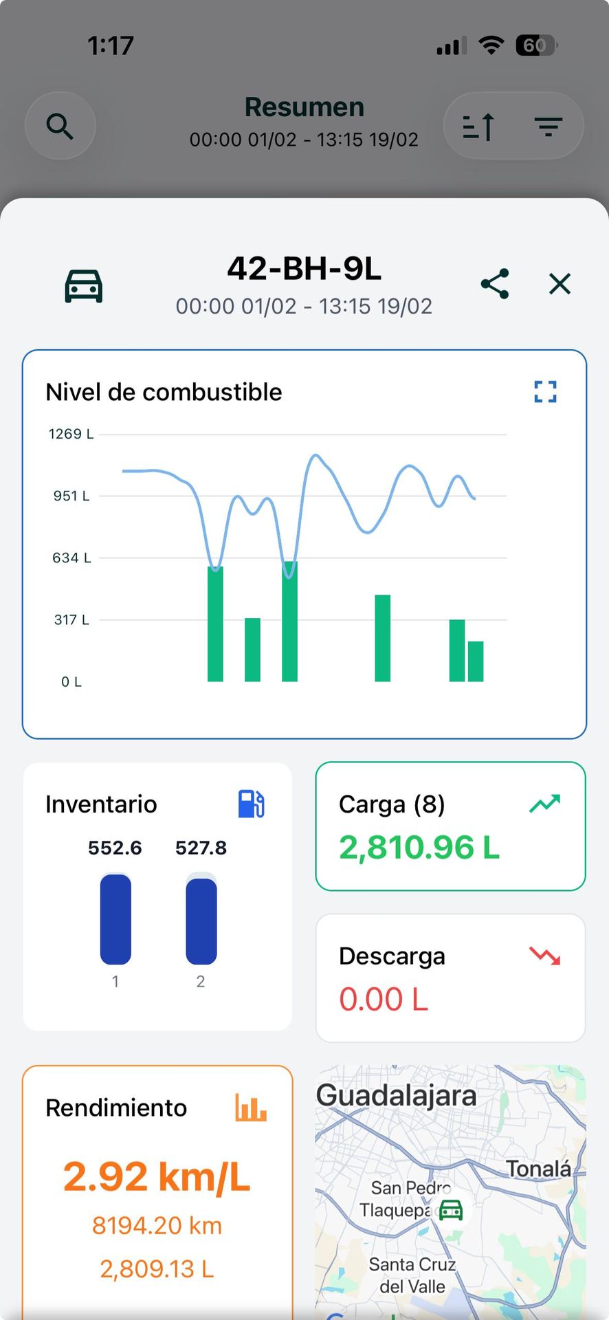 Muestra el listado de las cargas y descargas de la unidad, así como los detalles de cada uno de los eventos.